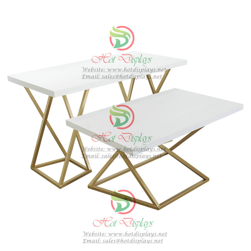 Current Position:Home >> Products >> Store FixturesFloor Standing Golden Garment Rack Clothes Nesting Tables China Wholesale Shoes Display Shelves with Rectangular Tubing and Wood Top DP-HD06