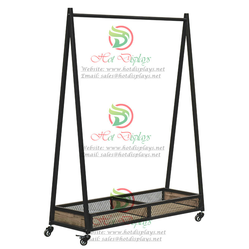 Current Position:Home >> Products >> Store FixturesFloor Standing Clothes Rack with Timber Base Storage Shelf & Wire Net Basket DP-TW12