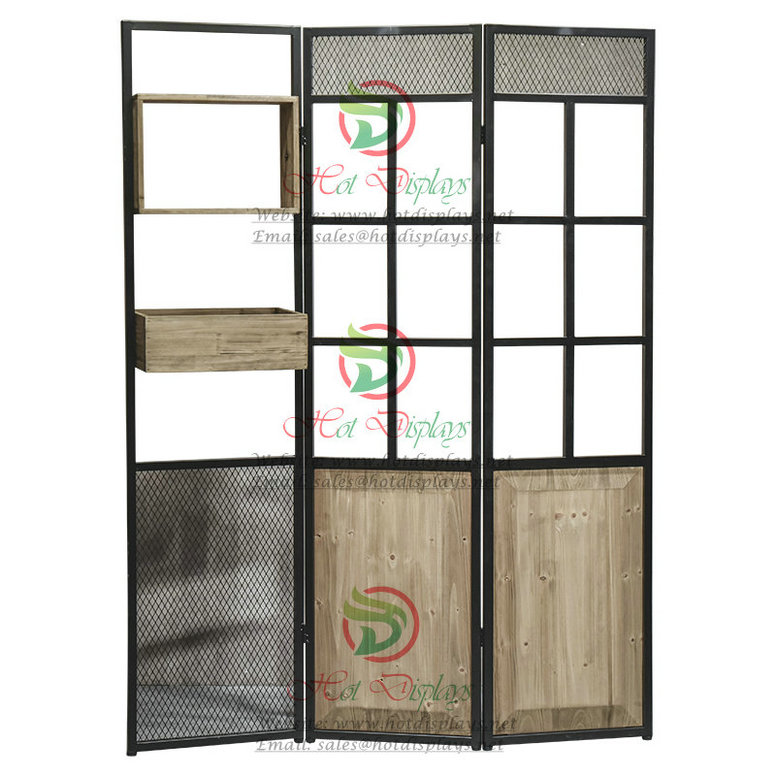 Current Position:Home >> Products >> Store FixturesFloor Standing Clothes Display Rack Folding Screen with Timber Book Shelf & Drawer DP-TW15