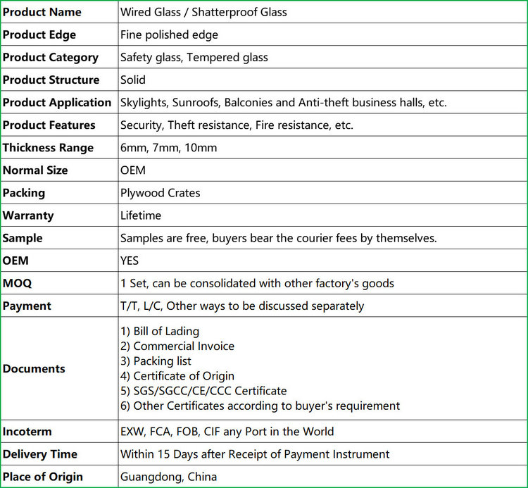 Wired glass is also called shatterproof glass and steel wire glass. It is a special glass formed by pressing the wire mesh into the semi-liquid glass ribbon during the calendering production process. The advantage is that it has higher strength than ordinary glass. When the glass is impacted or the temperature changes drastically, it will be broken but not broken, cracked but not scattered, so as to avoid small pieces of edge and corners flying out and hurting people, such as fire spread, when the wired glass is heated and burst, It can still maintain a fixed state and play a role in isolating the fire, so it is also called fireproof glass. The disadvantage is that in the production process, the wire mesh is easily oxidized by high temperature radiation, and the glass surface may appear yellow and bubbles like "rust spots". Wired glass is commonly used in skylights, ceiling covers, and doors and windows that are susceptible to vibration.